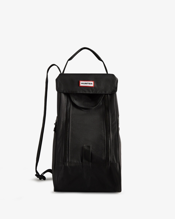 A medium-sized boot bag crafted from durable nylon with rubberized panels. Designed to carry short Hunter boots,the bag features a wide double zip opening,an exterior slip pocket and mesh panel. A practical design,a top handle and adjustable shoulder strap allow it to be easily carried.Water-resistantNylon twill exteriorSide pockets and exterior slip pocket for extra storageSide mesh for breathabilityPadded top handle for carryingAdjustable cross body strapHeight 37cm,depth 35cm,width 22cm,capacity 25L