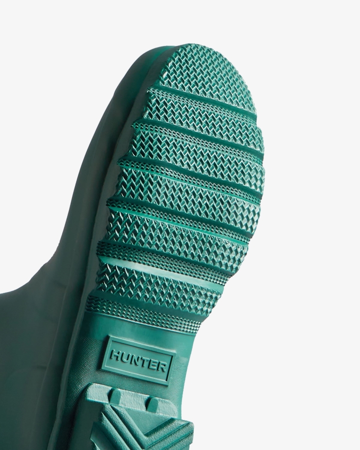 Size/Fit Summary: True to size,Regular fit with back adjustability.Designed for a flexible fit,the Original Short Adjustable Boot mirrors the iconic Original Tall with the addition of an expandable gusset at the back and a shorter leg height. Perfect for a wider calf,these matte boots in a green based blue offer ease of movement,and adjust from the traditional tailored Hunter fit to a more relaxed shape when the contrast gusset is fully extended. Handcrafted from natural rubber and featuring the signature Hunter Original tread,this Original adjustable short boot is fully waterproof and has been updated with a 100% recycled polyester lining and insole.We recommend that all Hunter boots be worn with socks to protect the wearer's skin from contact with rubber.Certified veganWaterproofHandcraftedPolyester liningAdjustable gusset and buckle at back to adjust fitRubber outsole with Original tread patternCrafted from natural vulcanised rubber with matte finish