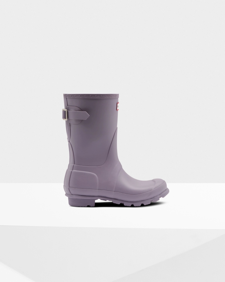 Size/Fit Summary: True to size,Regular fit with back adjustability.Designed for a flexible fit,the Original Short Adjustable Boot mirrors the iconic Original Tall with the addition of an expandable gusset at the back and a shorter leg height. Perfect for a wider calf,these matte boots in a seasonal purple offer ease of movement,and adjust from the traditional tailored Hunter fit to a more relaxed shape when the gusset is fully extended. Handcrafted from natural rubber,this Original adjustable short boot is fully waterproof with a comfortable polyester lining and signature Hunter Original tread.We recommend that all Hunter boots be worn with socks to protect the wearer's skin from contact with rubber.WaterproofHandcraftedPolyester liningAdjustable gusset and buckle at back to adjust fitRubber outsole with Original tread patternCrafted from natural vulcanised rubber with matte finish