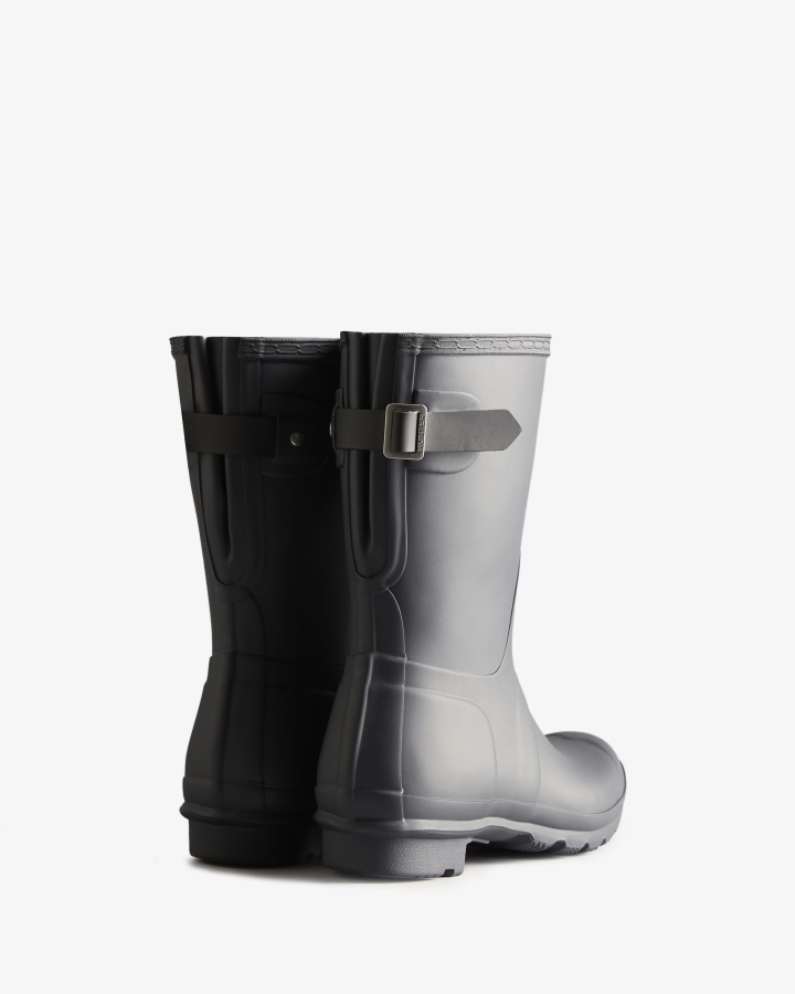 Size/Fit Summary: True to size,Regular fit with back adjustability.Note: This is a two-tone boot. The body of the boot is a dark grey,the buckle strap however is black.Designed for a flexible fit,the Original Short Adjustable Boot mirrors the iconic Original Tall with the addition of an expandable gusset at the back and a shorter leg height. Perfect for a wider calf,these matte boots in a grey and black combo offer ease of movement,and adjust from the traditional tailored Hunter fit to a more relaxed shape when the gusset is fully extended. Handcrafted from natural rubber,this Original adjustable short boot is fully waterproof with a comfortable polyester lining and signature Hunter Original tread.We recommend that all Hunter boots be worn with socks to protect the wearer's skin from contact with rubber.WaterproofHandcraftedPolyester liningAdjustable gusset and buckle at back to adjust fitRubber outsole with Original tread patternCrafted from natural vulcanised rubber with matte finish