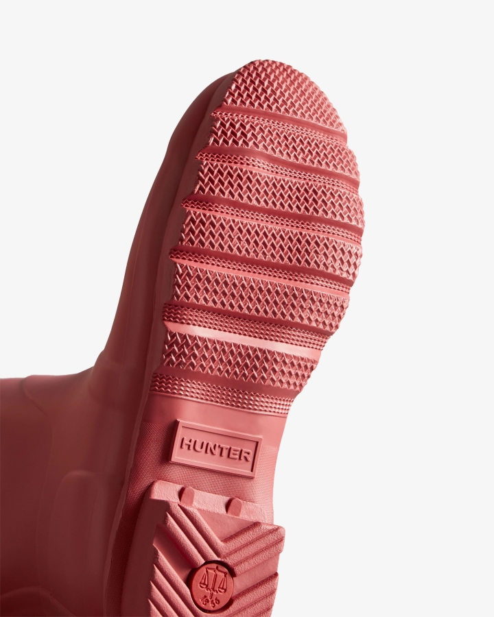 Size/Fit Summary: True to size,Regular fit with back adjustability.Designed for a flexible fit,the Original Tall Adjustable Boot mirrors the iconic Original Tall with the addition of an expandable gusset at the back. Perfect for a wider calf,these matte boots in seasonal dusty pink offer ease of movement and adjust from the traditional tailored Hunter fit to a more relaxed shape when the contrast orange gusset is fully extended. Handcrafted from natural rubber and the signature Hunter Original tread,the Original Adjustable boot is fully waterproof with an updated 100% recycled polyester lining and insole.We recommend that all Hunter boots be worn with socks to protect the wearer's skin from contact with rubber.Certified veganWaterproofHandcraftedRecycled polyester lining and insoleAdjustable gusset and buckle at back to adjust fitRubber outsole with Original tread patternCrafted from natural vulcanised rubber with matte finish