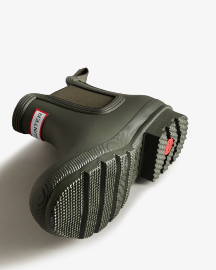 Size/Fit Summary: True to size,Regular fit which features new engineered improvements. If you are in-between sizes or want to wear a thick sock,it is recommended to size up.The Hunter Original Chelsea Boot has been re-engineered for an improved fit and all-day comfort. A wider ankle circumference,and an increased curve in the heel and around the Achilles tendon delivers an even more comfortable fit.The new and improved Hunter Original Chelsea Boot has an even more optimum fit to maximise all-day comfort. Ready for rain,each boot is handcrafted from natural rubber and vulcanized for superior protection. Retaining the iconic features of a traditional Chelsea,it features elasticated-gussets and has a nylon pull-tab to make stepping into the boot easy. In a classic olive green matte,these men's waterproof Chelsea's are a wet weather wardrobe essential.We recommend that all Hunter Chelsea boots be worn with Hunter Chelsea socks,which have been technically designed to protect the wearer's skin from contact with rubber in specific areas.WaterproofHandcraftedWaterproofPolyester liningRubber outsole with Hunter Original tread patternElastic side gussets and nylon pull-tabCrafted from natural vulcanised rubber with a matte finish