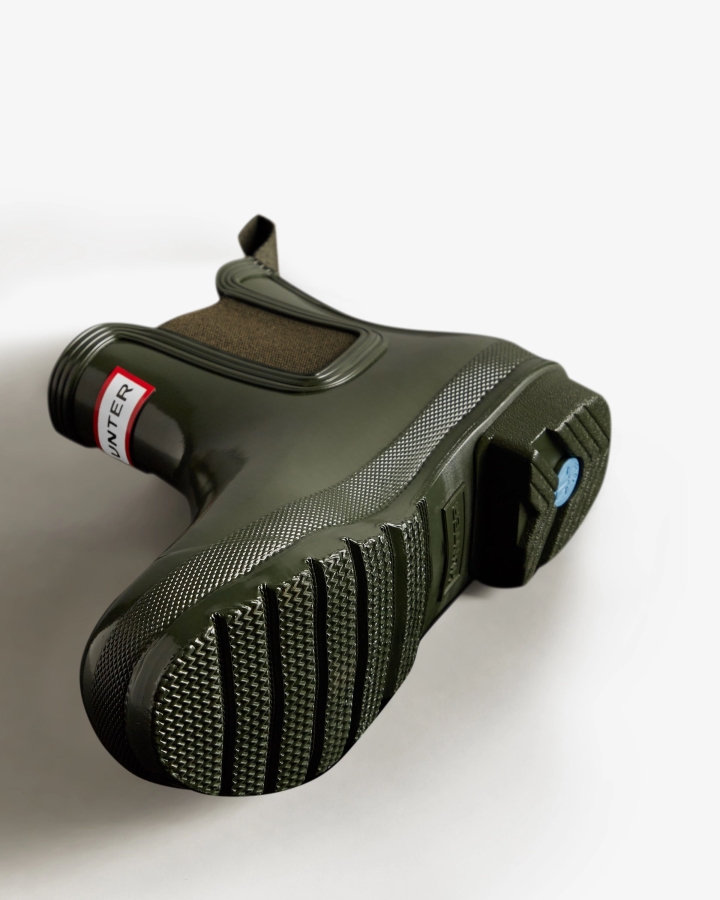 Size/Fit Summary: True to size,Regular fit with the addition of being slightly fitted around the foot. If you are in-between sizes,have a wider foot or want to wear a thick sock,it is recommended to size up.The Hunter Original Chelsea Boot has been re-engineered for an improved fit and all-day comfort. A wider ankle circumference,and an increased curve in the heel and around the Achilles tendon delivers an even more comfortable fit.The new and improved Hunter Original Chelsea Boot has an even more optimum fit to maximise all-day comfort. Ready for rain,each boot is handcrafted from natural rubber and vulcanized for superior protection. Retaining the iconic features of a traditional Chelsea,it features elasticated-gussets and has a nylon pull-tab to make stepping into the boot easy. In a classic olive green gloss,these waterproof Chelsea's are a wet weather wardrobe essential.We recommend that all Hunter Chelsea boots be worn with Hunter Chelsea socks,which have been technically designed to protect the wearer's skin from contact with rubber in specific areas.WaterproofHandcraftedPolyester liningRubber outsole with Hunter Original tread patternElastic side gussets and nylon pull-tabCrafted from natural vulcanised rubber with a gloss finish
