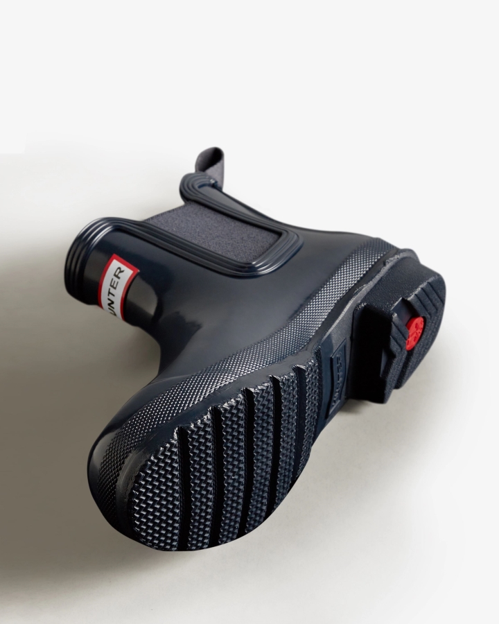 Size/Fit Summary: True to size,Regular fit with the addition of being slightly fitted around the foot. If you are in-between sizes,have a wider foot or want to wear a thick sock,it is recommended to size up.The Hunter Original Chelsea Boot has been re-engineered for an improved fit and all-day comfort. A wider ankle circumference,and an increased curve in the heel and around the Achilles tendon delivers an even more comfortable fit.The new and improved Hunter Original Chelsea Boot has an even more optimum fit to maximise all-day comfort. Ready for rain,each boot is handcrafted from natural rubber and vulcanized for superior protection. Retaining the iconic features of a traditional Chelsea,it features elasticated-gussets and has a nylon pull-tab to make stepping into the boot easy. In a classic navy gloss,these waterproof Chelsea's are a wet weather wardrobe essential.We recommend that all Hunter Chelsea boots be worn with Hunter Chelsea socks,which have been technically designed to protect the wearer's skin from contact with rubber in specific areas.WaterproofHandcraftedPolyester liningRubber outsole with Hunter Original tread patternElastic side gussets and nylon pull-tabCrafted from natural vulcanised rubber with a gloss finish