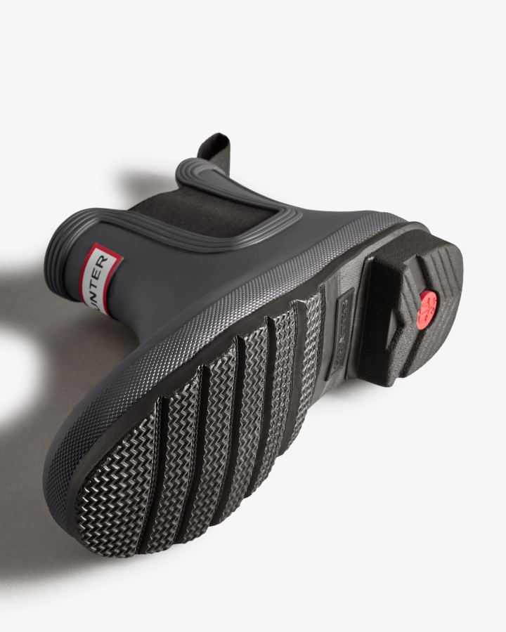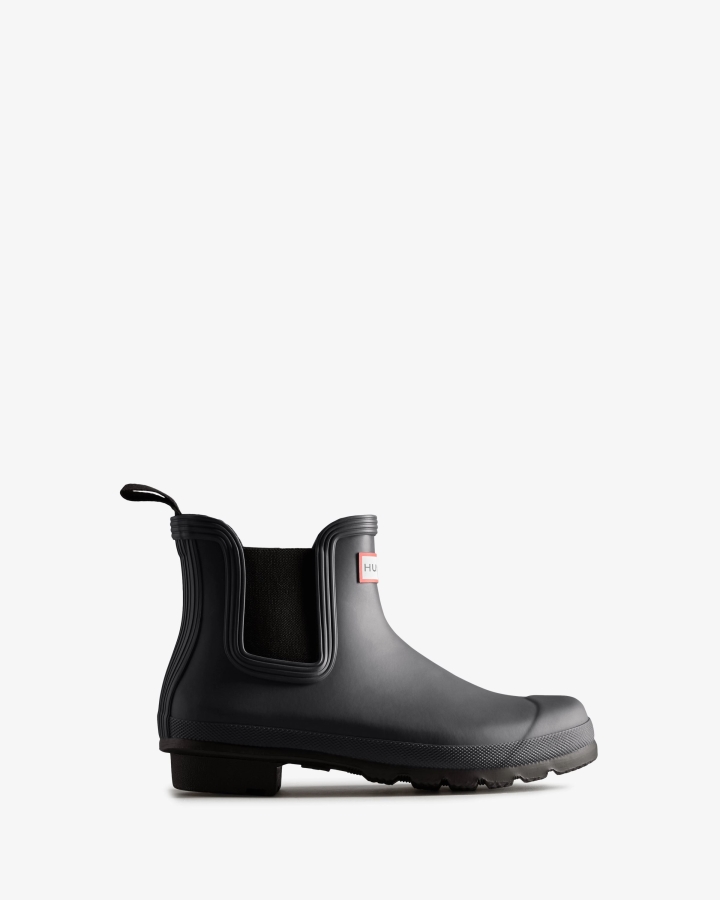 Size/Fit Summary: True to size,Regular fit with the addition of being slightly fitted around the foot. If you are in-between sizes,have a wider foot or want to wear a thick sock,it is recommended to size up.Note: This is a two-tone boot. The body of the boot is a dark grey,the sole and accents however are black.The Hunter Original Chelsea Boot has been re-engineered for an improved fit and all-day comfort. A wider ankle circumference,and an increased curve in the heel and around the Achilles tendon delivers an even more comfortable fit.The new and improved Hunter Original Chelsea Boot has an even more optimum fit to maximise all-day comfort. Ready for rain,each boot is handcrafted from natural rubber and vulcanised for superior protection. Retaining the iconic features of a traditional Chelsea,it features elasticated-gussets and has a nylon pull-tab to make stepping into the boot easy. Finished in a deep grey and black combo,these waterproof Chelsea's are a wet weather wardrobe essential.We recommend that all Hunter Chelsea boots be worn with Hunter Chelsea socks,which have been technically designed to protect the wearer's skin from contact with rubber in specific areas.WaterproofHandcraftedPolyester liningRubber outsole with Hunter Original tread patternElastic side gussets and nylon pull-tabCrafted from natural vulcanised rubber with a matte finish