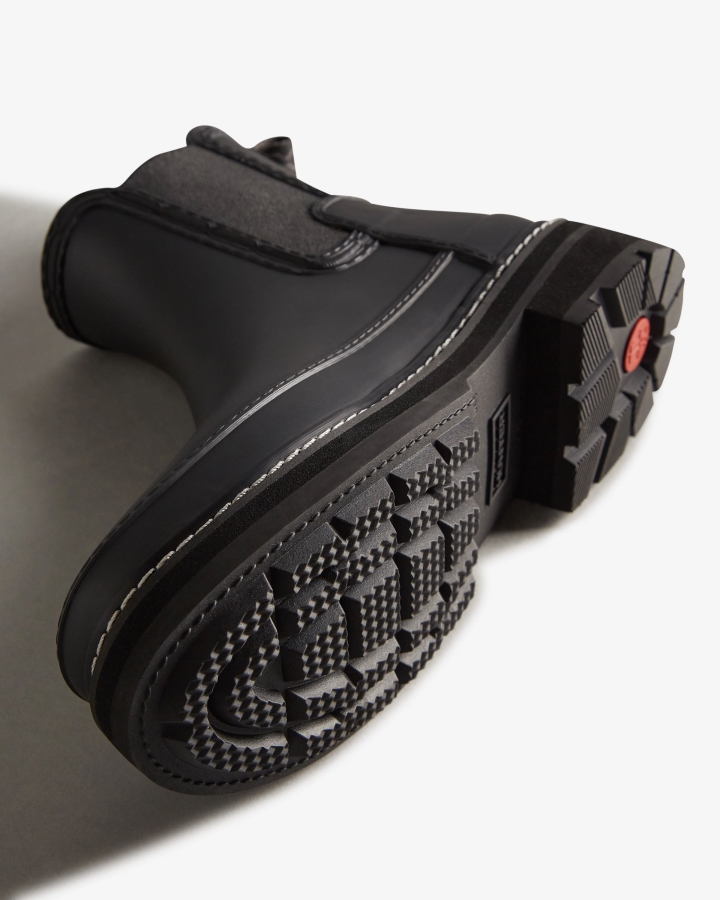 Size/Fit Summary: Fits smaller. Slim fit around the ankle. It is recommended to size up.With the focal point being the chunky sole,this Women's Refined Chelsea boot is fully waterproof and is adorned with a stylish stitch detail around the rubber and EVA outsole. Handcrafted from natural rubber with a nylon pull-tab and elastic gusset for ease of foot entry,they are finished with a polyester lining for comfort. Retaining the iconic features of a traditional Chelsea,this black boot features a slightly more platformed outsole and chunkier heel for ultimate grip and support,ideal for city commuting.We recommend that all Hunter boots be worn with socks to protect the wearer's skin from contact with rubber.Certified veganWaterproofHandcraftedPolyester liningRubber and EVA outsole with Hunter Original tread patternElastic side gussets and nylon pull-tab for ease of foot entryCrafted from natural vulcanised rubber with matte finishWelted stich detail on outsole