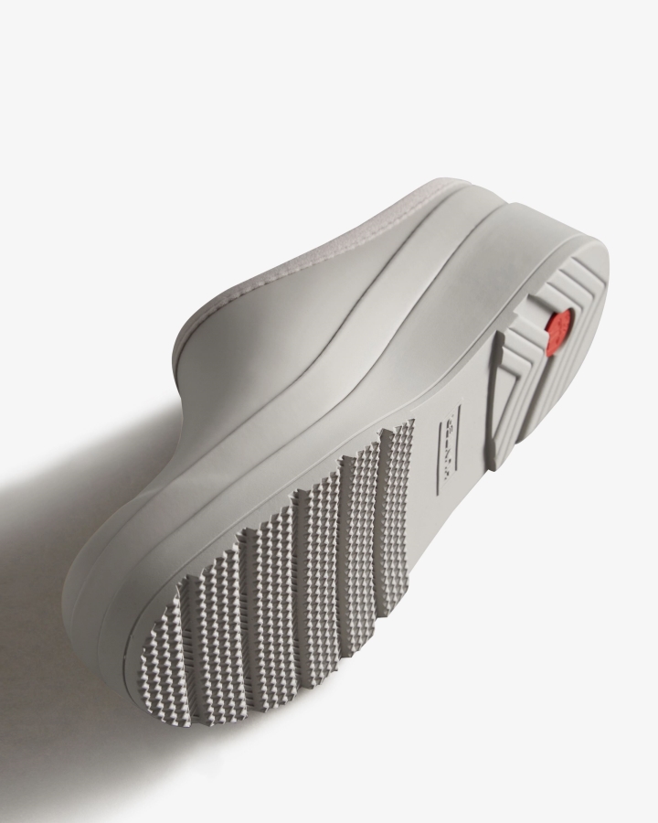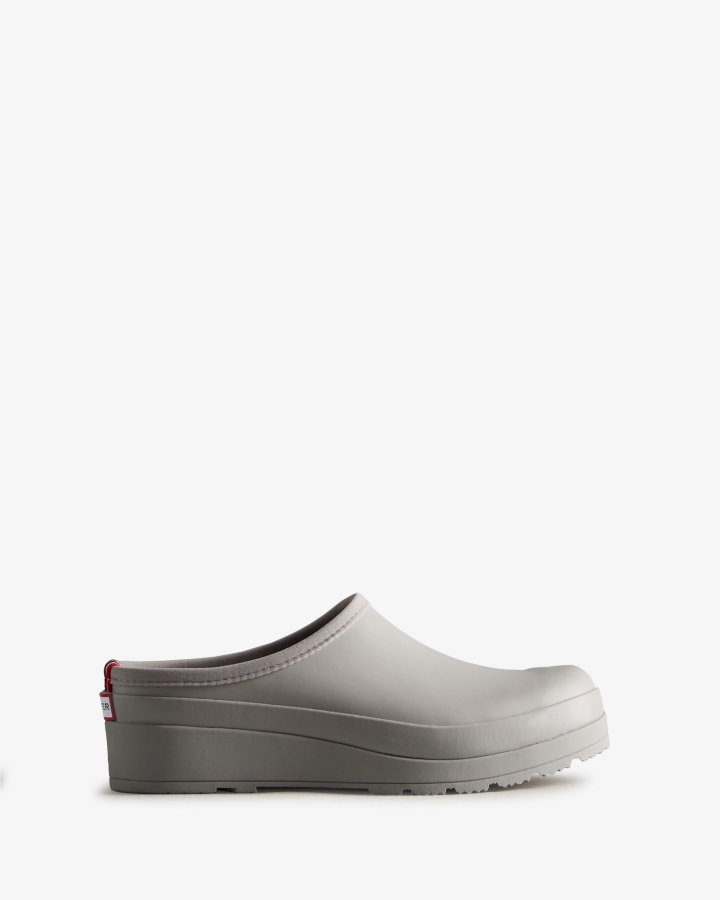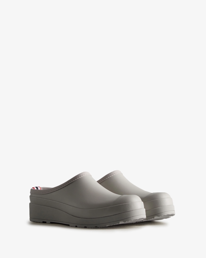Size/Fit Summary: Fits slightly larger. If you are in-between sizes,it is recommended to size down.The slip-on Women's PLAY Clog is made from the highest quality natural rubber and set on a flat platformed sole with an updated 100% recycled polyester lining and insole. New this season,the 100% waterproof Clog is engineered with over 160-years of Hunter's all-weather intelligence. Evocative of the bestselling PLAY Boot,this light grey matte-finished welly clog features a streamlined silhouette and can be worn indoors for easy protection or outdoors as a summer slip-on in the warmer monthsCertified veganWaterproofHandcrafted from natural rubberRecycled polyester lining and insoleSlip on styleRe-engineered for a lightweight feelHunter branded moulded outsoleSignature PLAY webbing detail on back heel