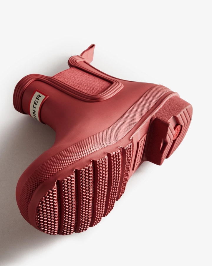 Size/Fit Summary: True to size,Regular fit with the addition of being slightly fitted around the foot. If you are in-between sizes,have a wider foot or want to wear a thick sock,it is recommended to size up.The Hunter Original Chelsea Boot has been re-engineered for an improved fit and all-day comfort. A wider ankle circumference,and an increased curve in the heel and around the Achilles tendon delivers an even more comfortable fit.The new and improved Hunter Original Chelsea Boot has an even more optimum fit to maximise all-day comfort and has been updated with a 100% recycled polyester lining and insole. Ready for rain,each boot is handcrafted from natural rubber and vulcanised for superior protection. Retaining the iconic features of a traditional Chelsea,it features elasticated-gussets and has a nylon pull-tab to make stepping into the boot easy. Finished in a dusty pink shade,these waterproof Chelsea's are a wet weather wardrobe essential.We recommend that all Hunter Chelsea boots be worn with Hunter Chelsea socks,which have been technically designed to protect the wearer's skin from contact with rubber in specific areas.Certified veganWaterproofHandcraftedRecycled polyester lining and insoleRubber outsole with Hunter Original tread patternElastic side gussets and nylon pull-tabCrafted from natural vulcanised rubber with a matte finish