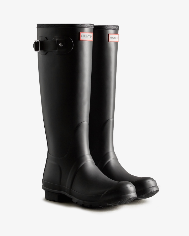 Size/Fit Summary: True to size,Regular fit. If you are in-between sizes,have a wider calf or want to wear a thick sock,it is recommended to size up.Perfect for wet weather conditions,this women's Rain Boot has been at the heart of the Hunter Original brand since its introduction in 1956. Formed of natural rubber,each pair is made from 28 hand-cut parts and assembled over three days on an aluminium last bespoke to Hunter,before being vulcanized for superior protection. Featuring the Hunter Original tread pattern,and a comfortable polyester lining,this classic matte black waterproof boot is a rainy-day necessity.We recommend that all Hunter boots be worn with socks to protect the wearer's skin from contact with rubber. All Hunter Boot Socks are specially designed for use with our boot range and feature a fold over top to cover the rubber and nylon boot edge,preventing any rubbing associated with wear.WaterproofHandcrafted from 28 partsPolyester liningRubber outsole with Hunter Original tread patternCrafted from natural vulcanised rubber with matte finish