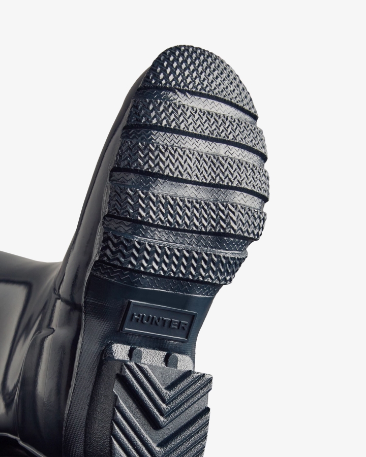Size/Fit Summary: True to size,Regular fit. Sizing suitable for 5-11 year olds (size 13-6).A mini version of the iconic Original Tall Boot,the Original Kids Gloss Rain Boot is a dream for junior explorers. This neutral navy waterproof boot is handcrafted from natural rubber with a gloss finish. Designed for adventures,our specialised kids boots are highly resistant to wear and abrasion with a polyester lining for comfort. Reflective patches and the Hunter Original tread offer added safety so you can be confident letting them take on the elements whatever the weather.We recommend that all Hunter boots be worn with socks to protect the wearer's skin from contact with rubber.WaterproofHandcraftedPolyester liningRubber outsole with Hunter Original tread patternReflective patches for increased visibilityCrafted from natural vulcanised rubber with gloss finish