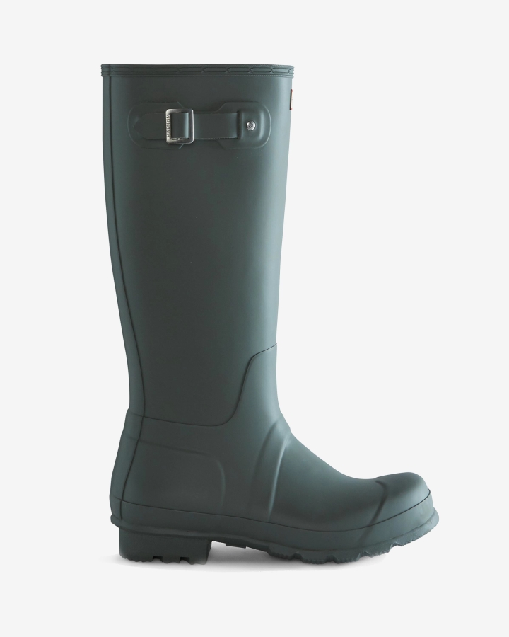 Size/Fit Summary: True to size,Regular fit.Designed to shield and protect from the elements,the Original Tall Rain Boot has been at the heart of the Hunter Original brand since its introduction in 1956. Formed of natural rubber,each pair is made from 28 hand-cut parts and assembled over three days on an aluminium last bespoke to Hunter,before being vulcanised for superior protection. Featuring the Hunter Original tread pattern and updated with a 100% recycled polyester lining and insole,this men's waterproof boot with a seasonal grey matte finish is a wet weather necessity.We recommend that all Hunter boots be worn with socks to protect the wearer's skin from contact with rubber. All Hunter Boot Socks are specially designed for use with our boot range and feature a fold over top to cover the rubber and nylon boot edge,preventing any rubbing associated with wear.Certified veganWaterproofHandcrafted from 28 partsRecycled polyester lining and insoleRubber outsole with Hunter Original tread patternCrafted from natural vulcanised rubber with matte finish