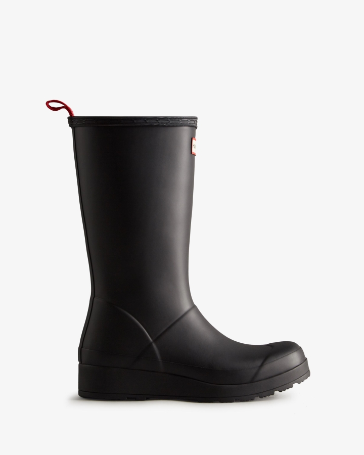 Size/Fit Summary: Slightly larger size,Regular fit. If you are in-between sizes,it is recommended to size down.Simplifying the iconic design of the Original Tall Boot,the Play Boot offers a dynamic silhouette with a flatter platform sole for maximum comfort and versatility. Crafted from the highest quality natural rubber this women's wellington is 100% waterproof. At a stylish mid-calf height,this tall black boot complements street style,festival flair and everything in between,so you can play it your way.We recommend that all Hunter boots be worn with socks to protect the wearer's skin from contact with rubber.WaterproofHandcrafted from natural rubberPolyester liningRe-engineered for a lightweight feelHunter branded moulded outsolePull tab for ease of foot entry